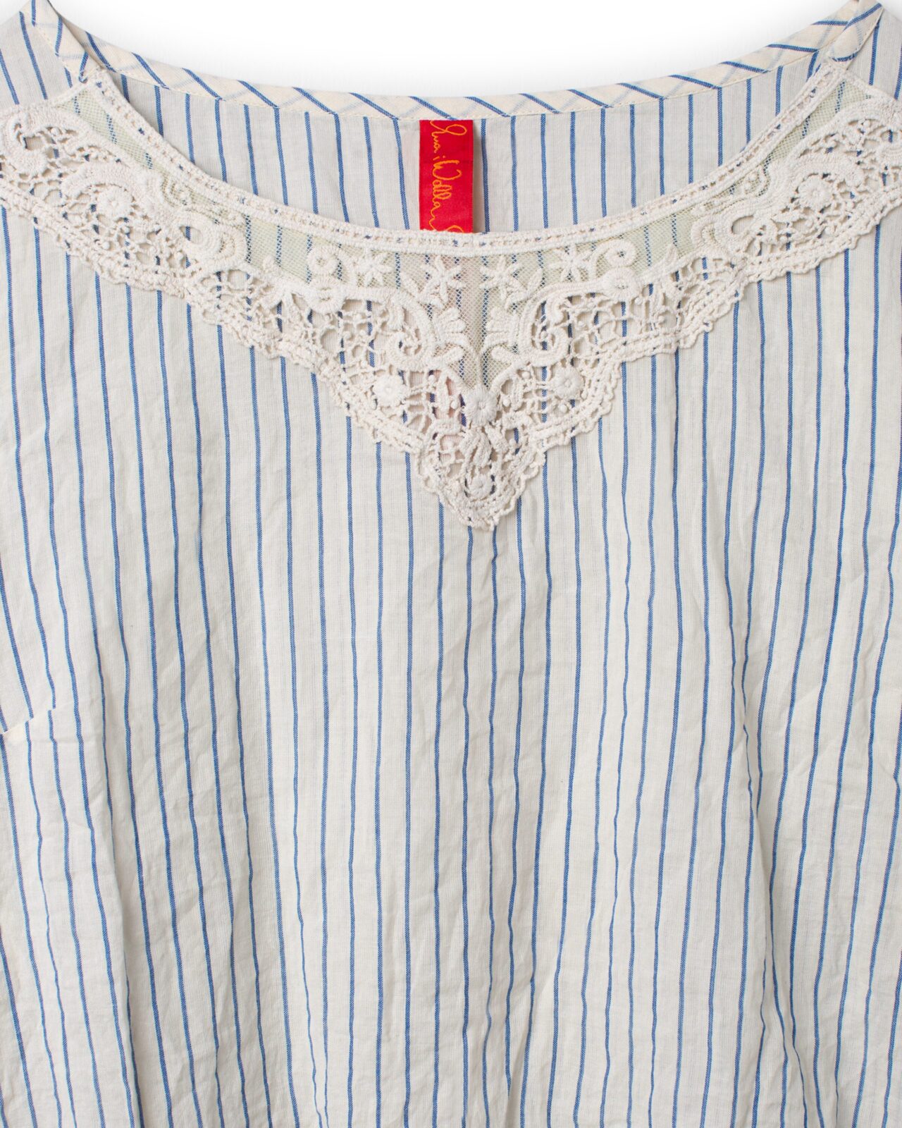 Featuring a softly flowing silhouette, the Simona blouse is designed with subtle vertical stripes that create an elongated, effortless look. A beautifully detailed lace-trimmed neckline adds a romantic, handcrafted feel, while fabric-covered buttons on the sides provide a unique design detail and gentle shaping.