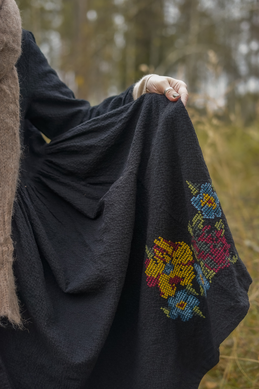 The Helin dress from Ewa i Walla captures timeless elegance with its calf-length silhouette, crafted from a soft and breathable cotton-wool blend. Adorned with delicate cross stitch embroidery, this romantic piece reflects artisanal craftsmanship and Scandinavian charm.