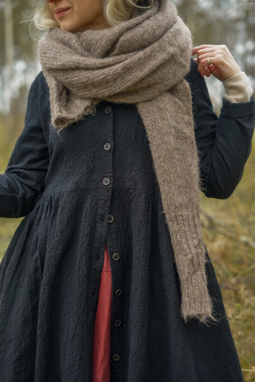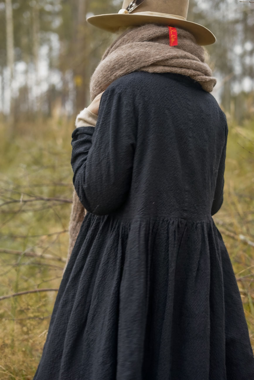 Featuring a lapel collar and front button closure, the Helin dress combines classic tailoring with everyday comfort. The wrinkled skirt flows gracefully from the waist, creating lovely natural volume, while side seam pockets add a practical touch to its refined design. Long sleeves make it a versatile choice for cooler days or transitional seasons.