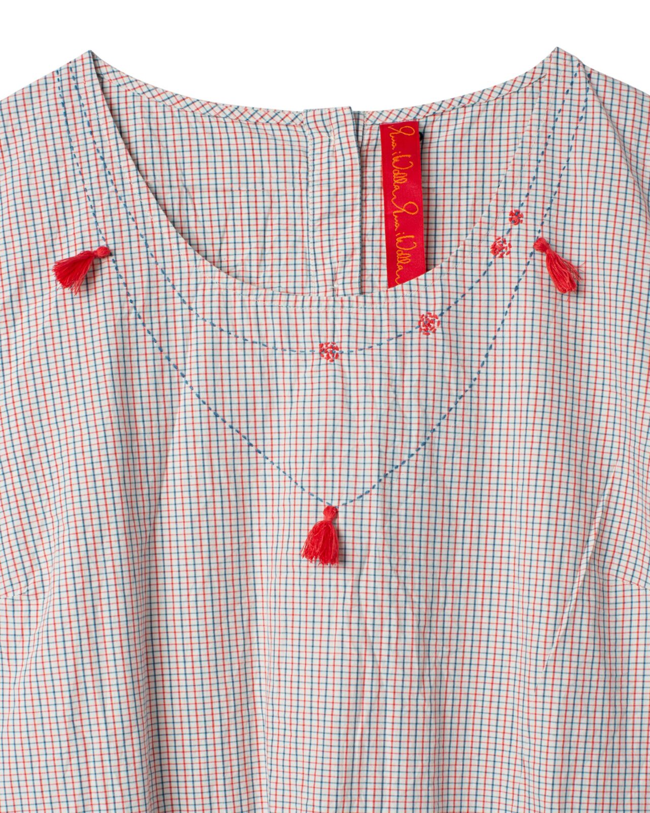 Artisanal Neckline: The front is beautifully accented with an embroidered necklace design, featuring delicate floral motifs and playful red tassels that add a pop of color.