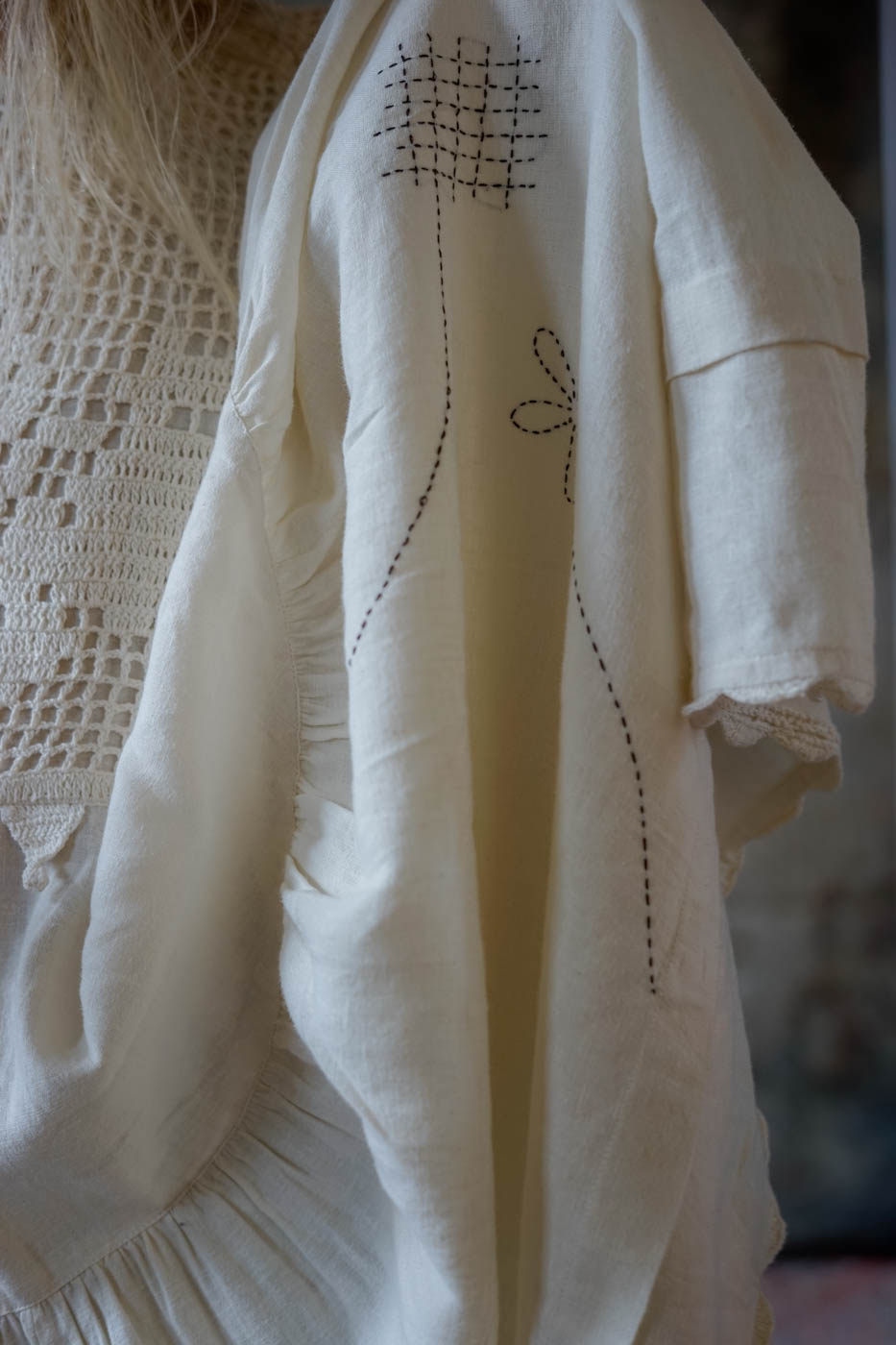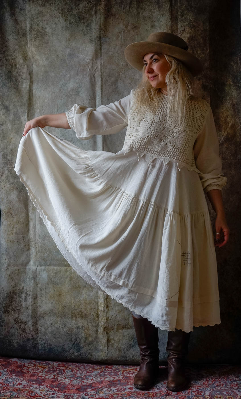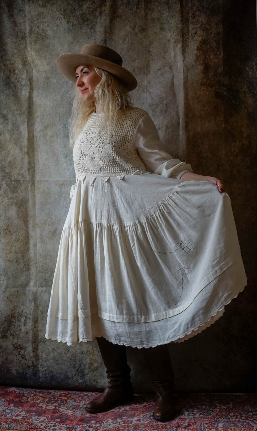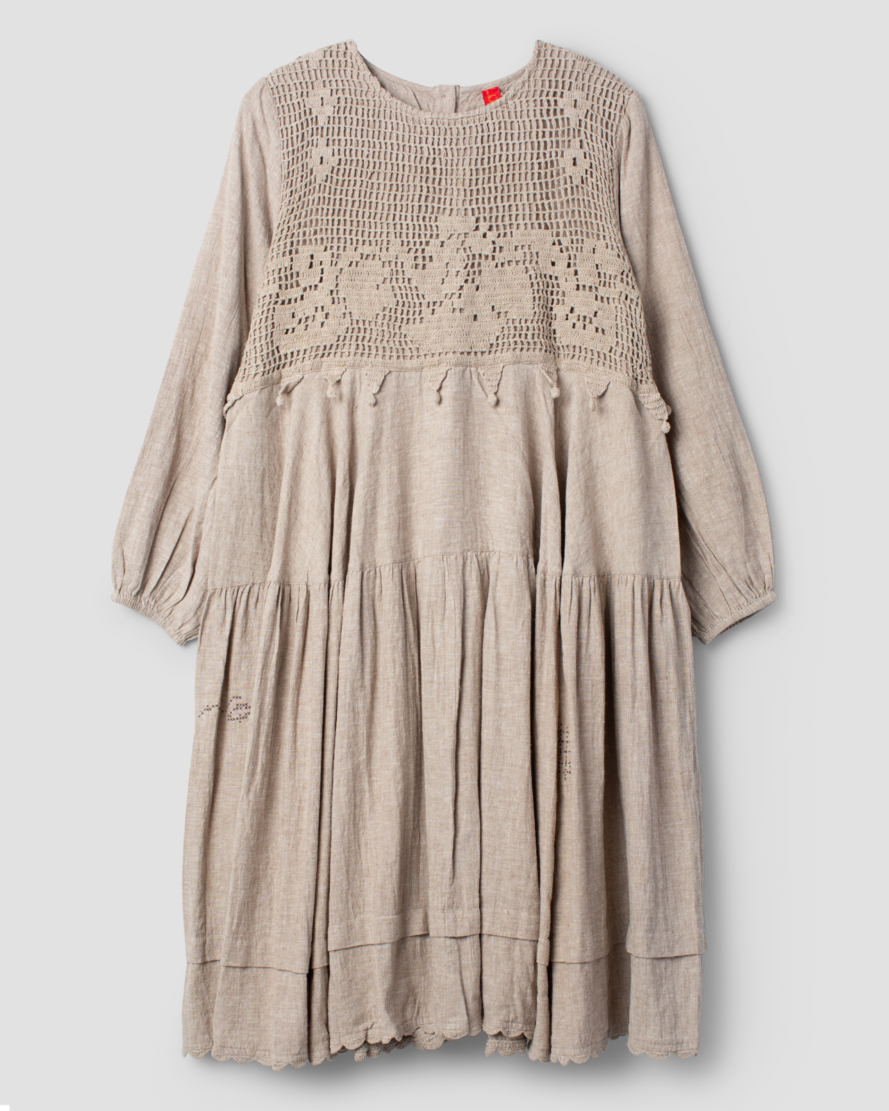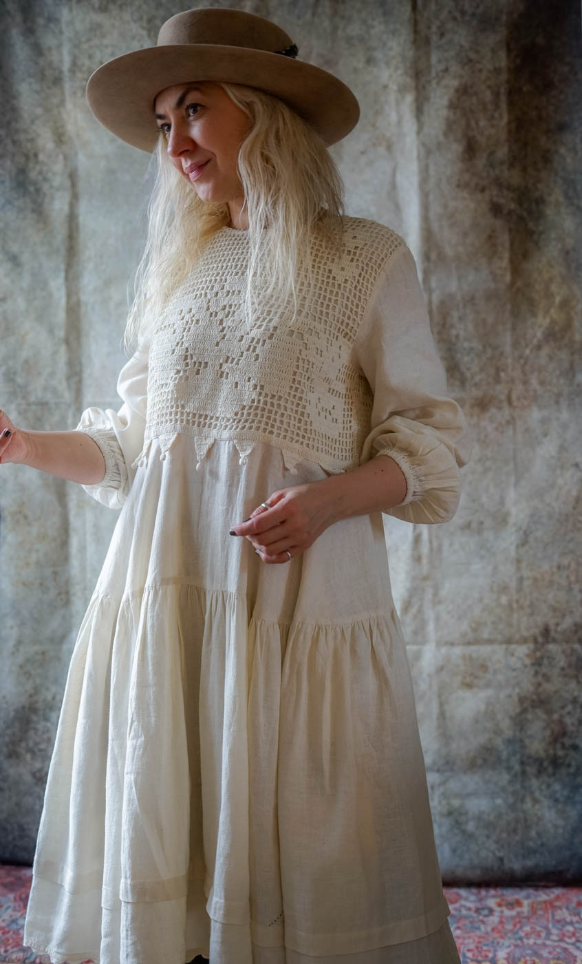 Calf length dress in linen with crocheted top, long sleeves with elastic hem.