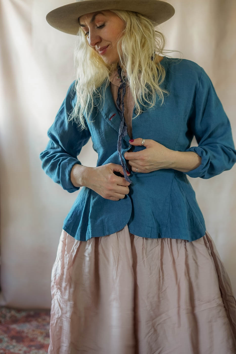 For the ultimate “Morbi” look, layer the Lucy jacket over the Merit dress and Felina skirt. The blue linen texture provides a sophisticated contrast to the flowy cotton prints, while the metal buttons offer a subtle, shimmering detail.