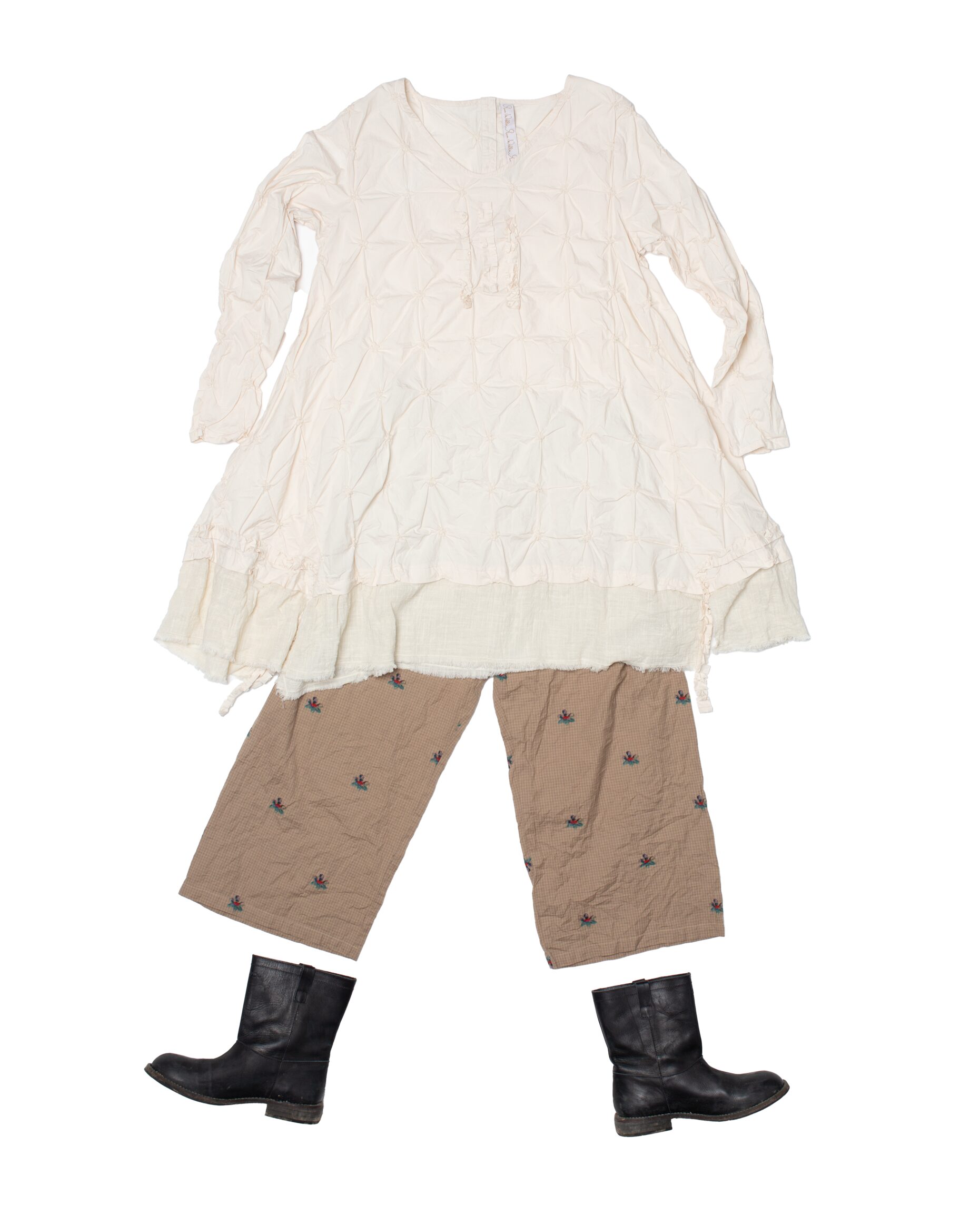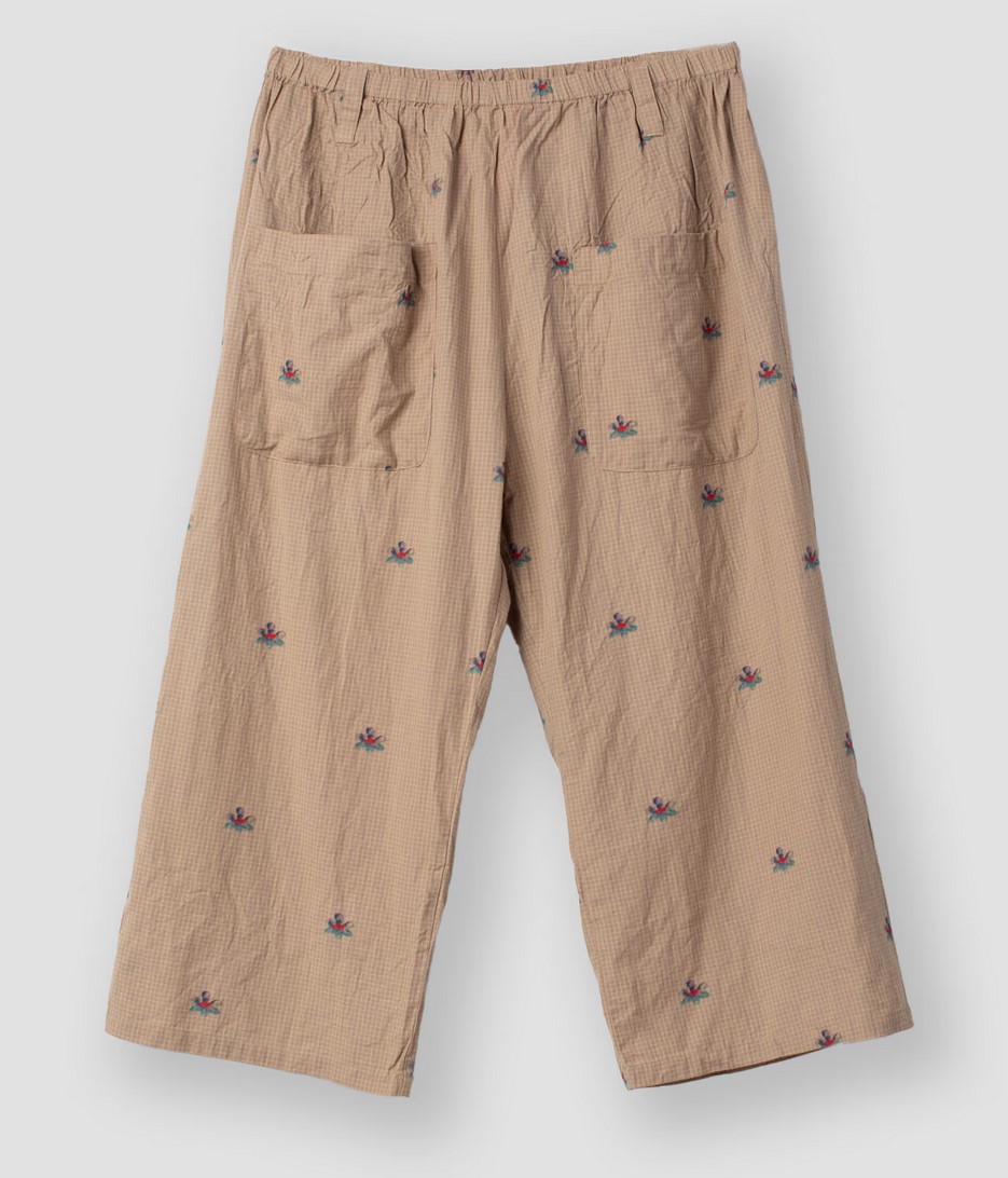 The elastic waistband with belt loops ensures a flexible fit while giving you the option to accessorize with your favorite belt. Front external pockets add a practical touch without compromising on style. The timeless checked pattern meets romantic floral details, creating a unique blend of classic and modern design.